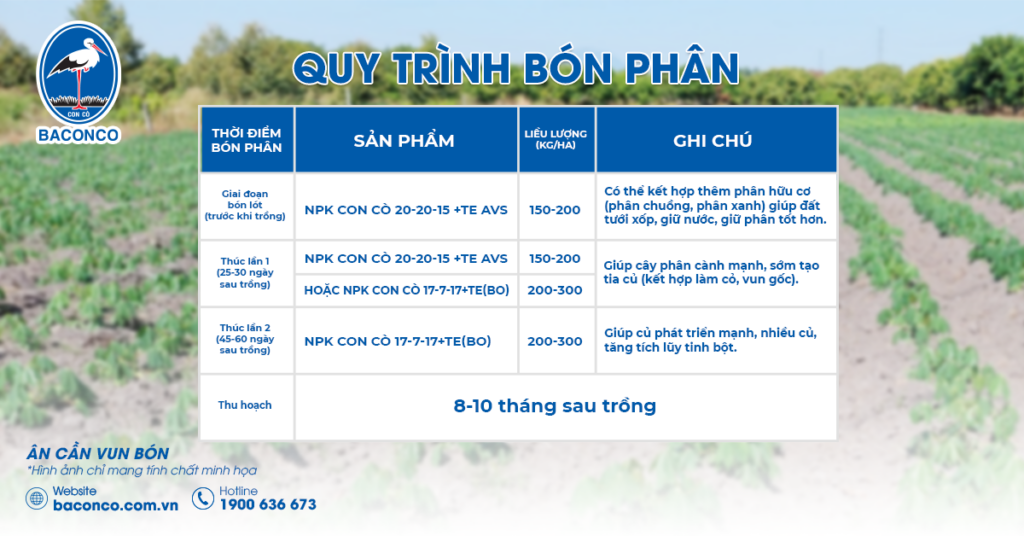 Currently, as the Winter-Spring crop season begins, to help farmers in Tay Ninh and other cassava-growing regions increase their yield and profit each season, Baconco proposes the following fertilization process for cassava plants: