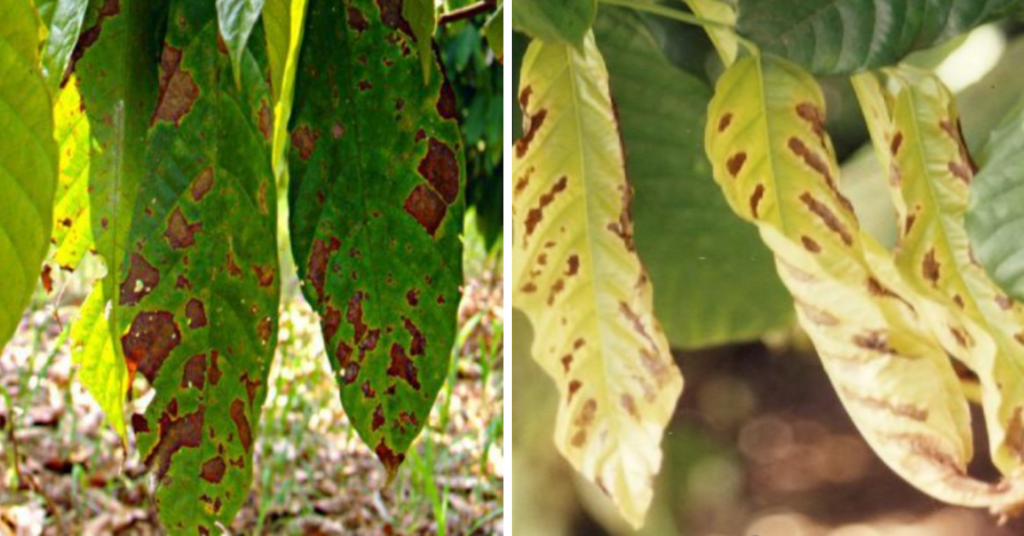 Cocoa trees lack calcium, causing leaves to wilt and turn yellow. Image: Internet