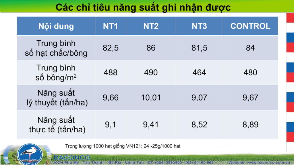 During the Winter-Spring 2024-2025 season, Baconco conducted a field trial of STORK Brand USP NPK 20-10-0+10.5Ca+7S in An Hoa commune, Trang Bang district, Tay Ninh province. The VN121 rice variety was used, with a growth period of 100 to 105 days. Four different treatments were applied on 1,500m² plots each, on slightly acidic soil that had been previously flooded.