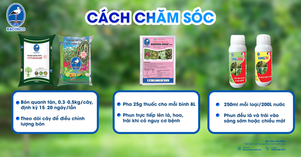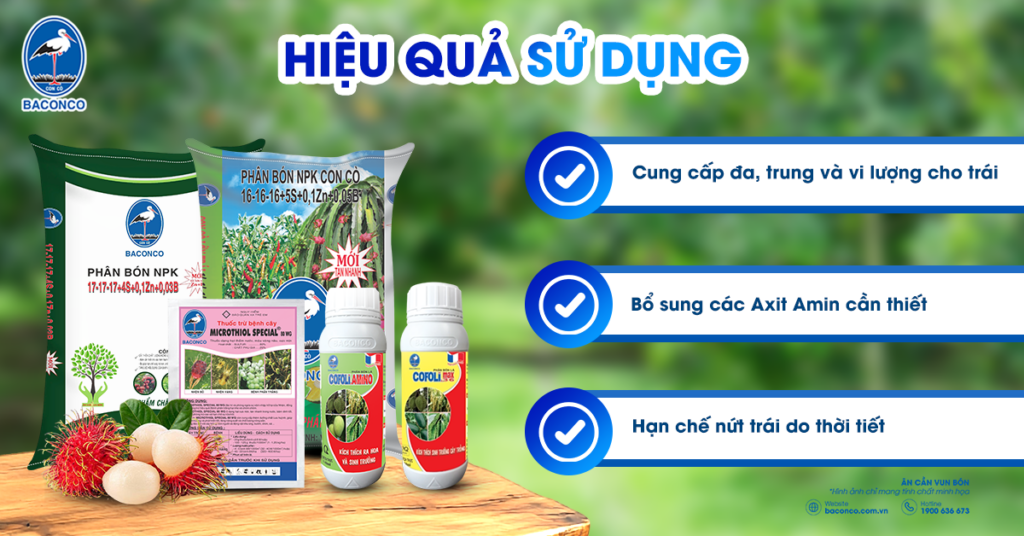Caring for rambutan trees the right way during the fruiting stage ensures healthy growth and high-quality yields. Using NPK CONCO fertilizer in combination with MICROTHIOL and COFOLI AMINO + COFOLI MAX36 improves nutrition, protects trees from diseases, and optimizes productivity. Let BACONCO guide you through effective care methods in the article below.