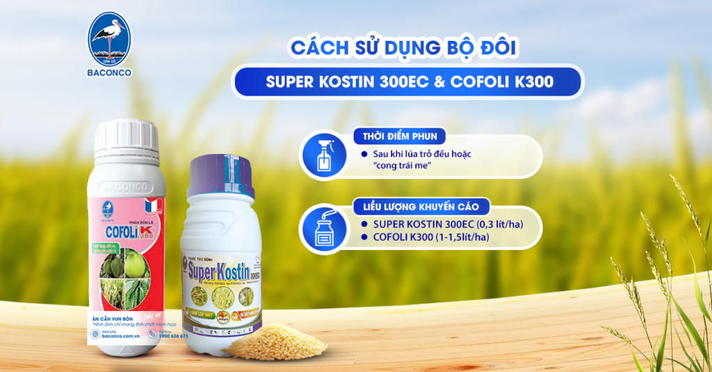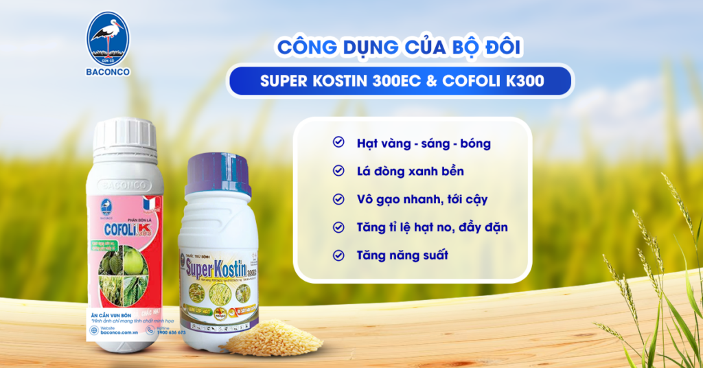 The combination of SUPER KOSTIN 300EC and COFOLI K300 offers outstanding benefits, helping to optimize yield and improve rice quality during the ripening stage. Here are 5 key benefits when using this product duo from BACONCO: