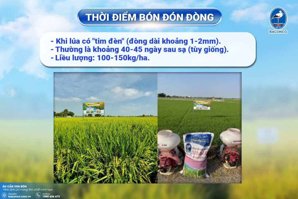 • Thời điểm bón: Khi lúa xuất hiện tim đèn (đòng dài khoảng 1-2 mm), thường 40-45 ngày sau sạ (tùy giống).